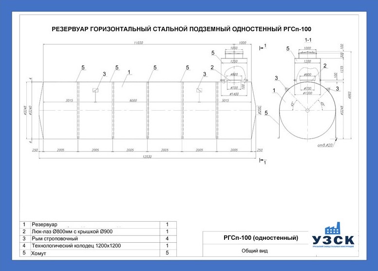 РГСп-100: горизонтальный резервуар одностенный подземного расположения;