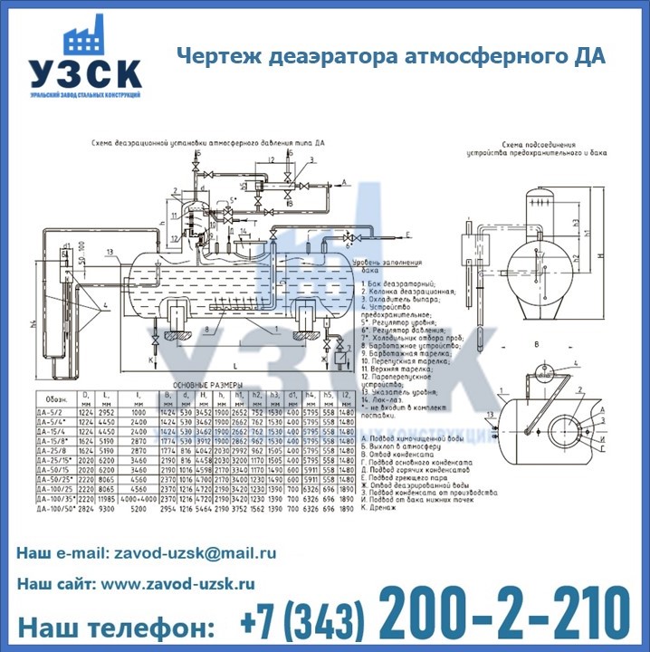 Приобрести качественное оборудование, в том числе, деаэраторы ДА, можно в компании УЗСК в Самаре. Мы предлагаем долговечную и надежную продукцию по приемлемой цене. Заказать и купить деаэраторы или другие изделия высокого качества можно через сайт Уральского Завода Стальных Конструкций, или позвонив по указанному в разделе «Контакты» телефону.